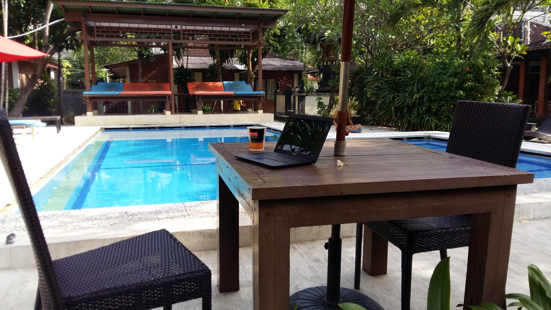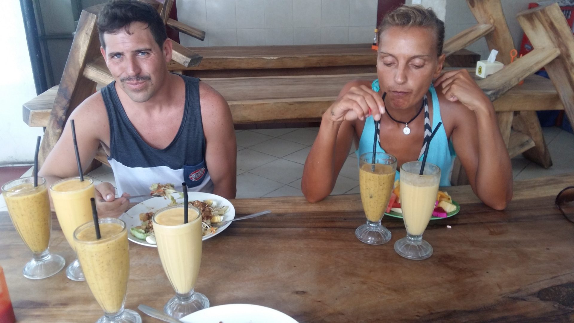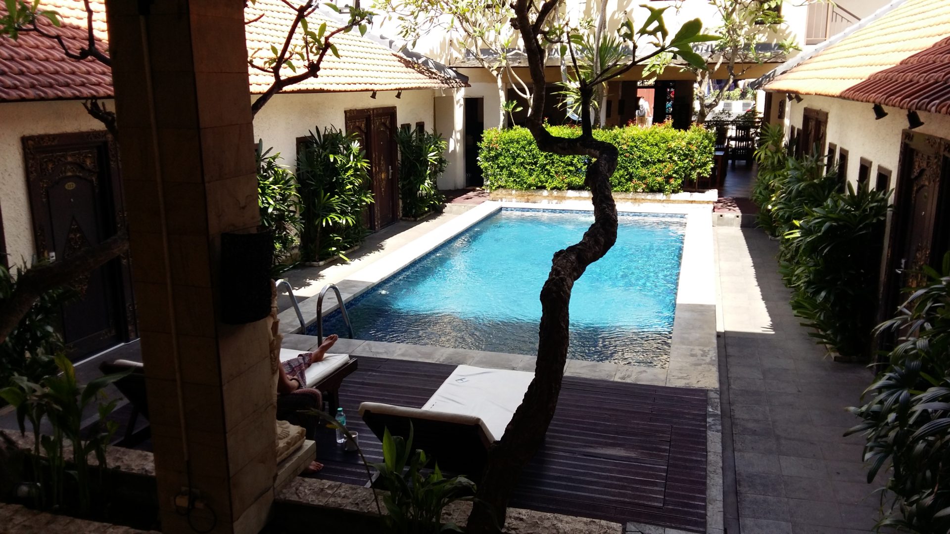 Nach dem Abenteuer Sulawesi genossen wir die Vorzüge Bali’s die da wären: Vegetarische Restaurants, Massagen und Surfen! Wir fanden mit dem „Ayu Lili Garden“ eine schöne kleine Unterkunft mit Bungalows und einem Pool. Es war Zentral in Kuta gelegen aber trotzdem ruhig, unsere Lieblingsrestaurants, Massage Salons und der Strand waren in 5 Minuten zu Fuß zu erreichen. Eigentlich wollten wir etwas durch Bali reisen, doch die Wellen waren gut und es hat uns in unserer Unterkunft so gut gefallen, dass wir den ganzen Monat dort blieben. Einen 3 Tages Abstecher zur Nachbarinsel Lembongan machten wir dennoch, wo wir wieder mit den Mantas schnorcheln konnten. Leider ist das Müllproblem noch viel größer geworden, die Mantas schwommen durch Tonnen von Plastikmüll. Auch beim Surfen waren wir teilweise umringt vom Müll.