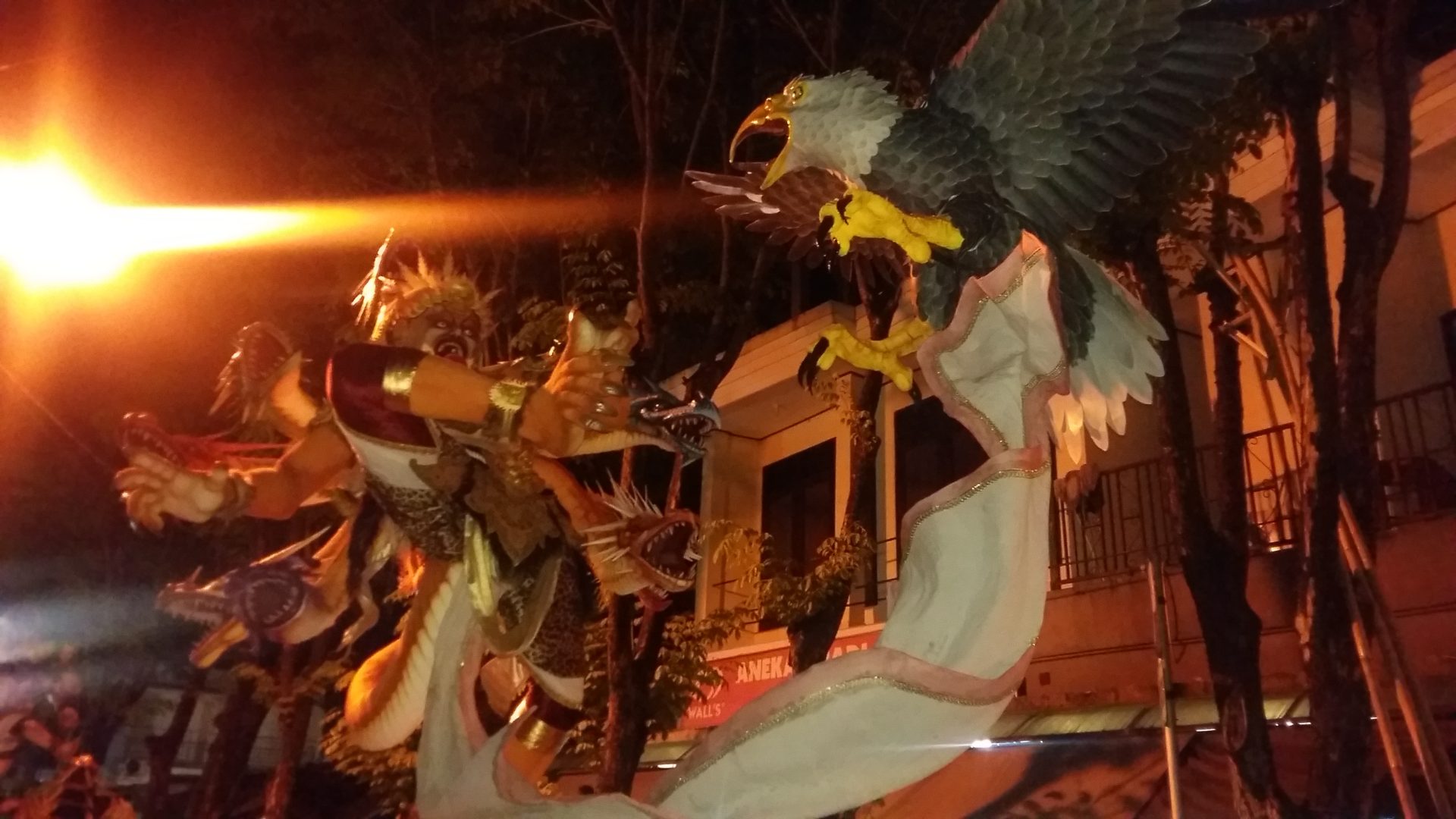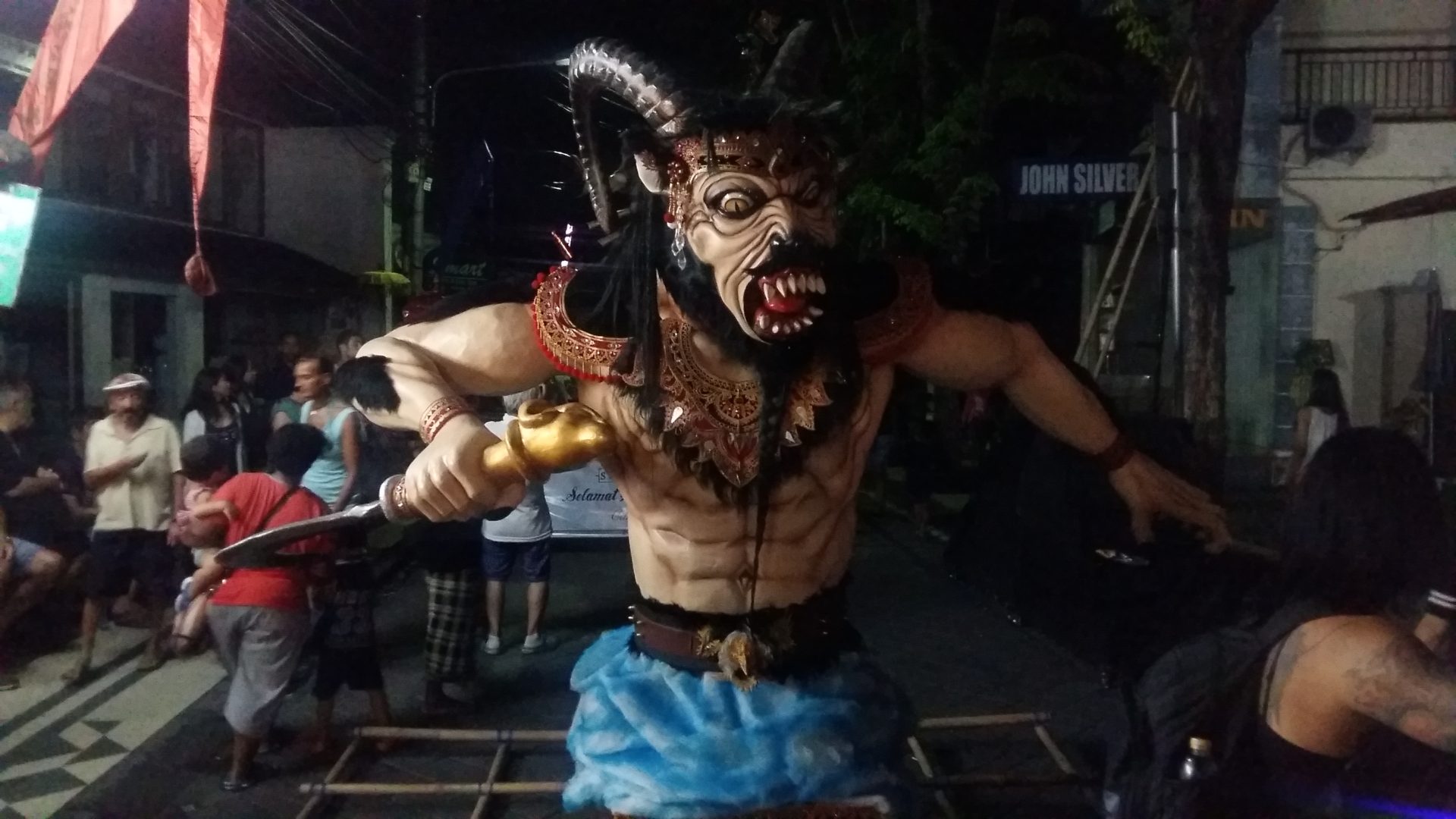 Zurück auf Bali konnten wir das Balinesische Neujahresfest „Nyepi“ miterleben. Die Einheimischen bauen große Skulputren, die böse Götter verkörpern und ziehen damit durch die Straßen. Die beste Skulptur und Performance wird von eine Jury gekührt. Danach werden die Skulputen verbrannt und die Geister damit vertrieben. Am nächsten Tag beginnt der „Silence Day“ an dem die Insel für 24 Stunden zur Ruhe kommt. Niemand darf auf die Straße, alle Läden sind geschloßen, keine Lichter dürfen angemacht werden und es sollte möglichst nicht gesprochen, dafür meditiert werden. Die Balinesen glauben, dass an Neujahr die bösen Geister an Bali vorbei fliegen und wenn die Insel ruhig und dunkel ist, glauben die Geister sie wäre unbewohnt und ziehen weiter.