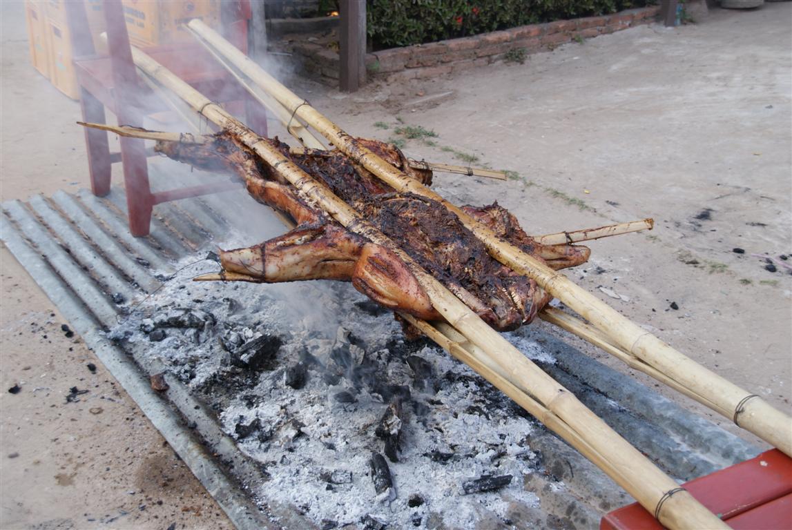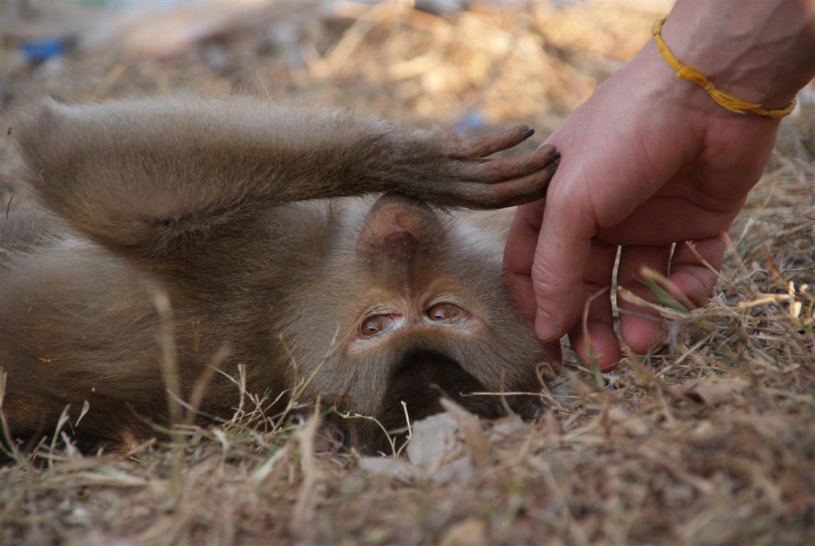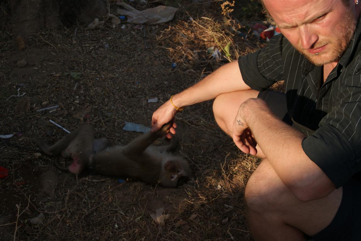 Leider haben wir auch hier einen Affen gefunden, der an einer 1m Kette den ganzen Tag in der prallen Sonne vor sich hin vegetiert. Abends beobachteten wir eine Frau, die ihn abholte. Auf einem Schild neben dem Affen stand „Touristen sollen dem Affen schöne Dinge schenken, aber nicht anfassen da er angeblich beißt“. Diese werden dann wohl von der Frau eingesackt. An unserem letzten Tag inspizierte Steven die Kette und den Affen etwas näher. Er war an der Stelle der Fessel schon ganz wund. Wir fütterten ihn für’s Erste, als wir Abends aus dem Internet Café kamen und es bereits dunkel war, ergriffen wir die Chance. Vicki checkte die Umgebung (Cafés, Bars, Läden) ob niemand in der Nähe ist und Steven löste die Kette. Free all Monkeys! Hoffentlich ist er schlau und rennt nicht gleich in’s nächste Café und tanzt dort auf den Tischen rum. Es ist uns auch klar, dass er evtl. nur ein paar Tage in Freiheit hat bevor man ihn wieder einfängt, vielleicht versteht die Frau dennoch die Botschaft, dass kein Tourist so etwas sehen möchte. Wir tauften ihn Django!