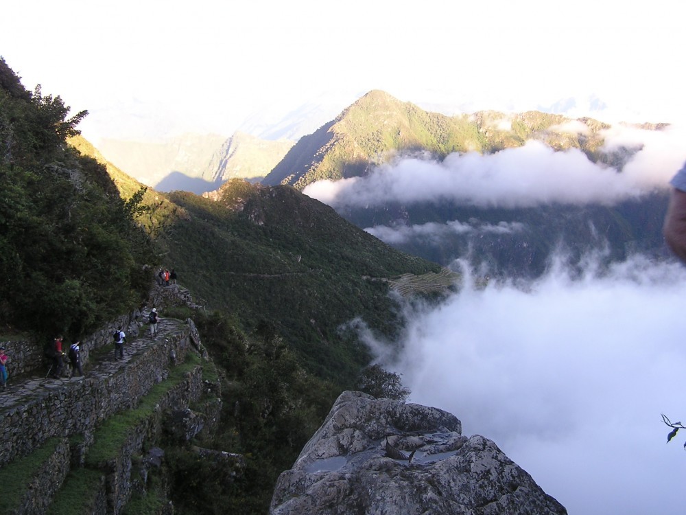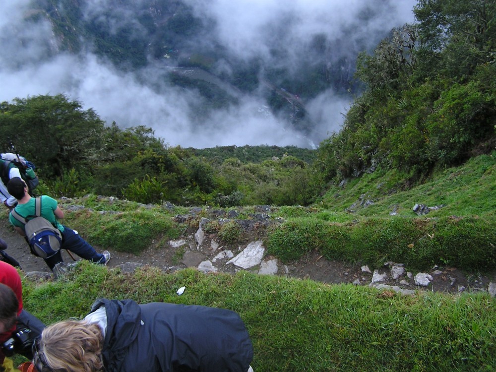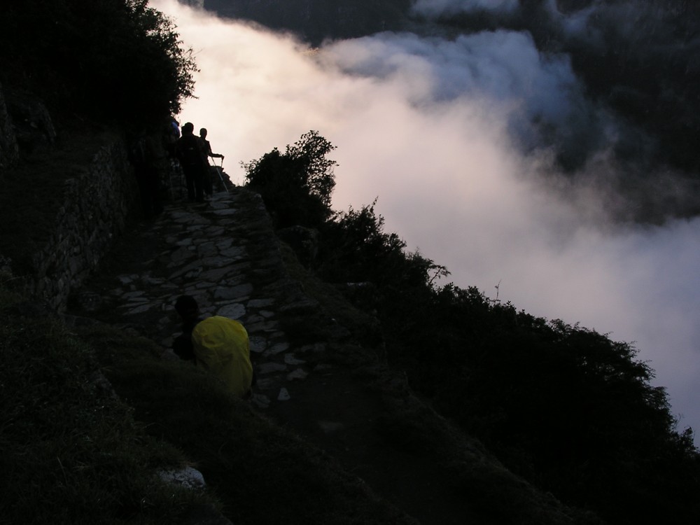 Wir wurden um 04:00h geweckt. Nach dem Frühstück machten wir uns auf die letzten 6km zum „Intipunku“ dem Sonnentor. Von hier aus fallen die ersten Sonnenstrahlen beim Sonnenaufgang durch ein Mauerwerk auf Machu Picchu. Da wir noch von einem Parkwächter aufgehalten wurden, mussten wir uns ganz schön beeilen, um vor Sonnenaufgang am Intipunku anzukommen. Mit Taschenlampen bewaffnet ging es zügig einen zum großen Teil flachen weg entlang. Das dieser an steilen Klippen entlang führte, viel Steven im Dunkeln zum Glück nicht auf. Hier ging es zum Teil mehrere hundert Meter gerade neben dem 1 Meter breitem Weg hinunter.