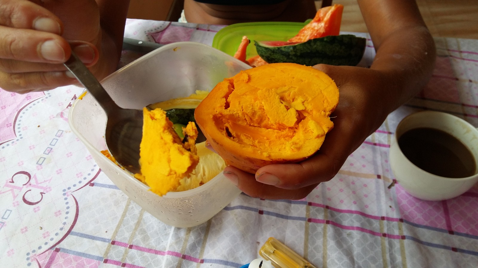 An einem Abend zeigte uns Brianca, wie man Kürbis Curry und Dahl zubereitet. Sie schickte uns tagsüber mit einer Einkaufsliste los und abends haben wir zusammen gekocht. Alle halfen in unserer kleinen Küche und es schmeckte wirklich lecker. Ab diesen Tag haben wir dann ab und zu selbst gekocht.