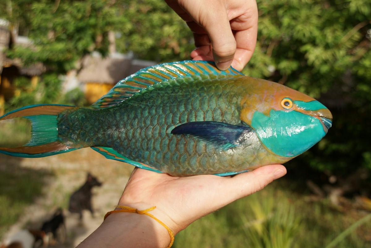 Abends schnorchelten wir an einem anderen Strand und Vicki fand einen Papageienfisch tot am Meeresgrund. Er war noch sehr frisch, er konnte höchstens eine Stunde tot sein, die erste Krabbe schien sich für ihn zu interessieren. Woran er gestorben war lies sich nicht ermitteln, er sah aber sehr gesund aus sodass wir eine Krankheit ausgeschlossen haben. Wir haben nicht lange überlegt und entschieden uns ihn auf den Grill zu werfen. Wir ernähren uns seit mehreren Jahren vegetarisch doch nicht weil Fisch und Fleisch uns nicht schmeckt, sondern lediglich aus Tierschutzgründen. Dieser Fisch ist jedoch nicht gestorben weil er dem Menschen als Delikatesse dienen sollte, diesen Fisch hat es nach einem Leben in Freiheit vermutlich auf natürlichem Wege dahingerafft. Diese Chance kommt so schnell nicht wieder dachten wir und nahmen ihn mit zu unserer Hütte wo die Besitzerin der Anlage uns erlaubte ihre Küche zu benutzen. Steven nahm ihn aus (er hatte vor Jahren ja mal einen Angelschein) dann füllten wir ihn mit Knoblauch, salzten ihn und warfen den bunten Hund auf den Grill. So richtig überwältigt waren wir am Ende nicht, er ist nicht gerade die Delikatesse unter den Meeresbewohnern, schlecht geschmeckt hat er aber auch nicht, Steven erinnerte der Geschmack etwas an den einer Brasse aus heimischen Gewässern.