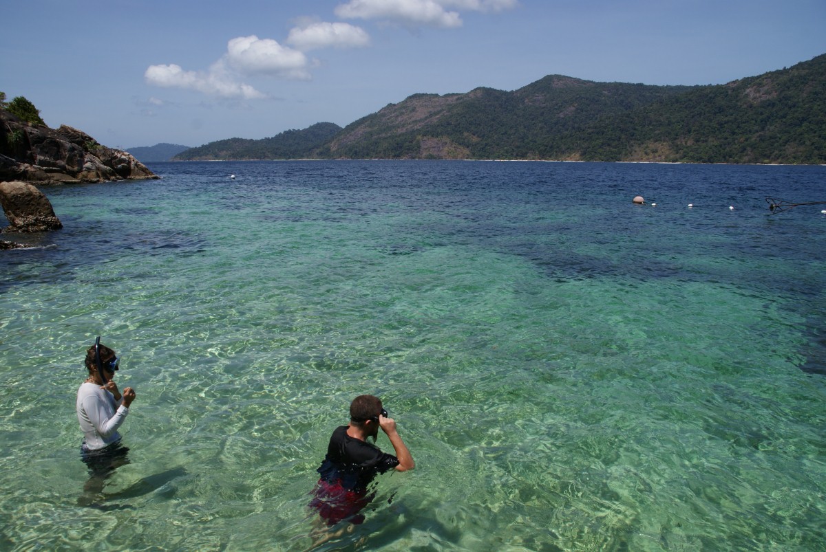 Am ersten Tag gingen wir nur ein bißchen baden, am nächsten morgen standen wir früh auf, schnappten unser Schnorchelzeug und gingen zum Strand. Wir entdeckten eine winzige vorgelagerte Insel etwa 200m draußen im Meer. Das Wasser war kristallklar und wir schwammen hinüber. Hier gab es einen kleinen Strand, ein paar Felsen und Bäume und sonst nix, wir hätten unsere eigene kleine Insel! Wir badeten und genossen die Einsamkeit und schnorchelten erst weiter, als nach einer Weile auch andere Schnorchler strandeten. Es war traumhaft schön.
